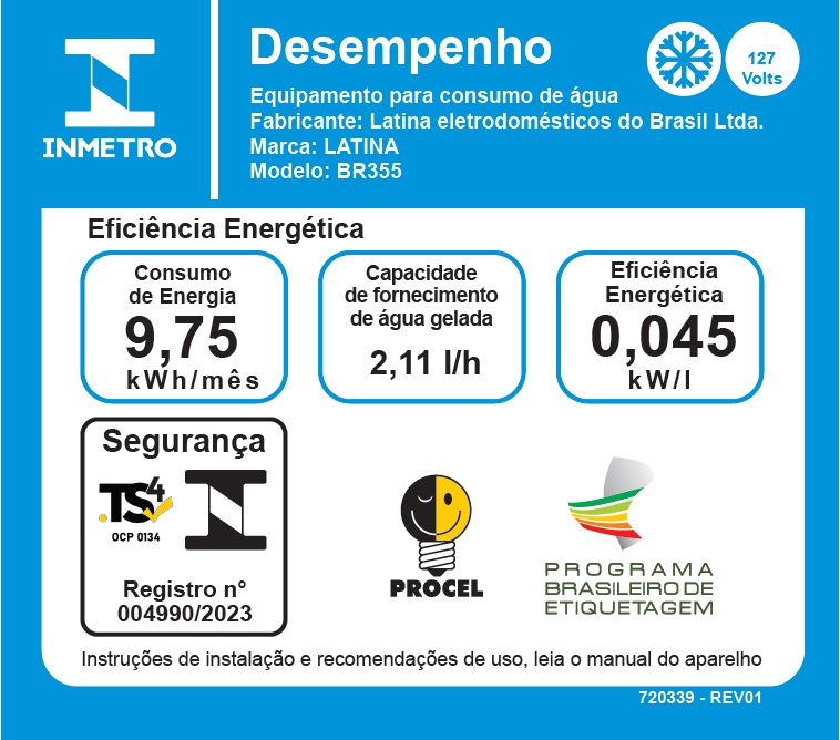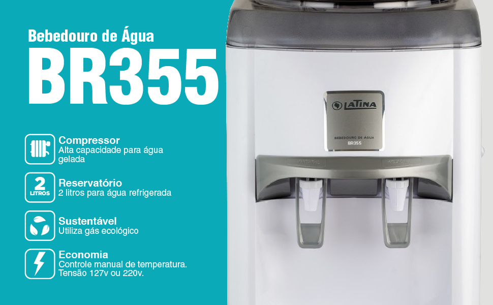 O BR355 da Latina é um bebedouro com alta capacidade de fornecimento de água gelada que pode ser utilizado tanto em ambiente doméstico quanto corporativo. Ele é super prático porque tem controle manual de temperatura que possibilita maior eficiência energética, alça para fácil mobilidade, duas torneiras e bandeja removível. Seu sistema de refrigeração por compressor utiliza gás ecológico e conta com reservatório de 2 litros para água gelada.