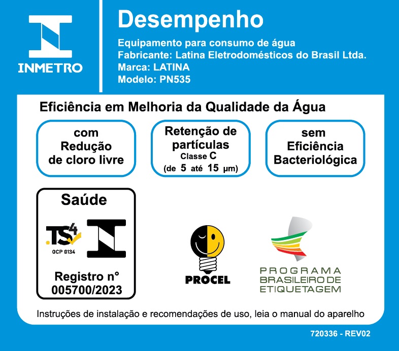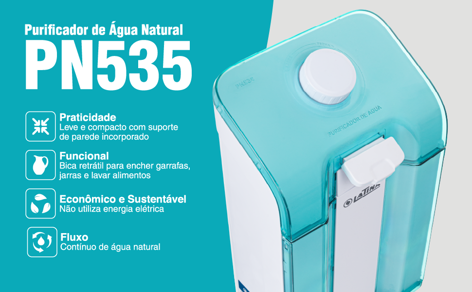 O PN535 da Latina é um purificador de água natural, aprovado pelo Inmetro com excelente classificação para retenção de partículas e cloro. Além disso, esse produto tem bica retrátil para encher jarras, garrafas e lavar alimentos, bandeja removível e suporte de parede incorporado ao aparelho, podendo ser afixado na parede ou posicionado em cima de uma mesa ou pia porque é super compacto e não ocupa espaço.