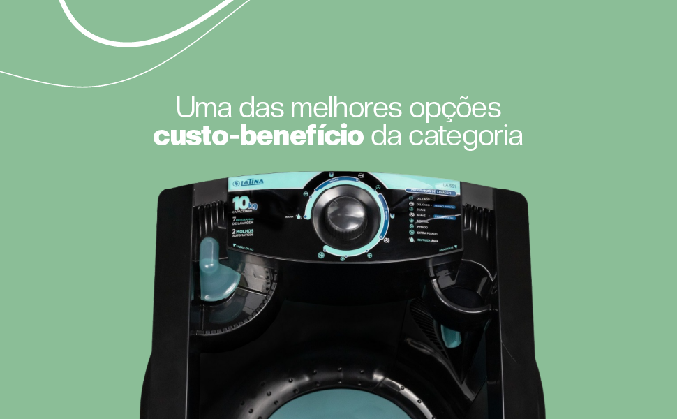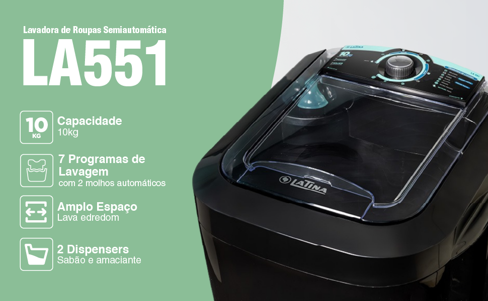 A LA551 é a lavadora semiautomática com melhor custo benefício. Com 7 programas de lavagem e 2 molhos automáticos, conta com uma super turbina que lava melhor e protege as roupas. Possui 2 dispensers sendo um para sabão e outro para amaciante, tem ainda Maxifiltro de fiapos, pés reguláveis e alça para transporte.