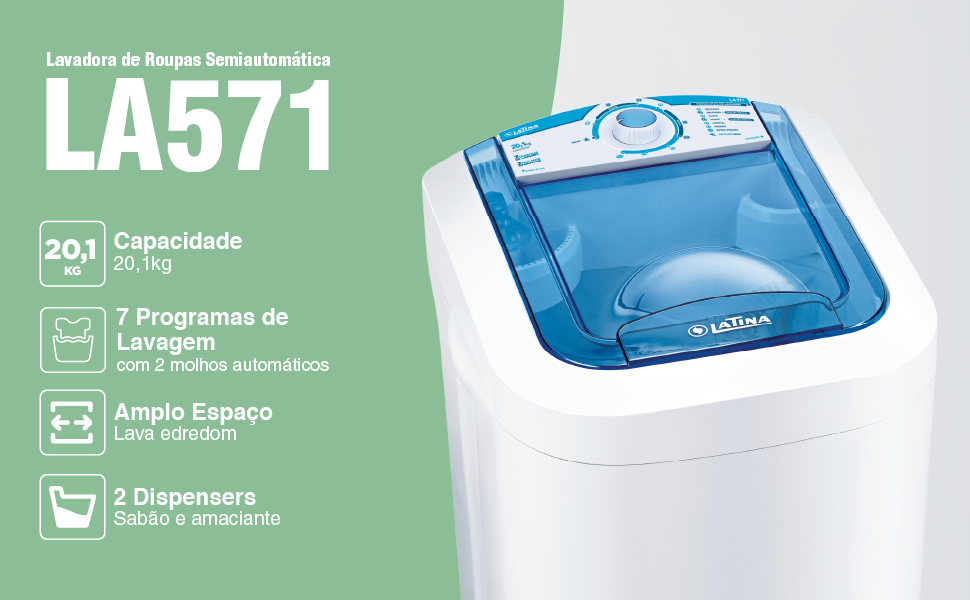 A LA571 é a lavadora semiautomática com melhor custo benefício e excelente capacidade. Com 7 programas de lavagem e 2 molhos automáticos, conta com uma super turbina que lava melhor e protege as roupas. Possui 2 dispensers sendo um para sabão e outro para amaciante, tem ainda Maxifiltro de fiapos, pés reguláveis e alça para transporte.