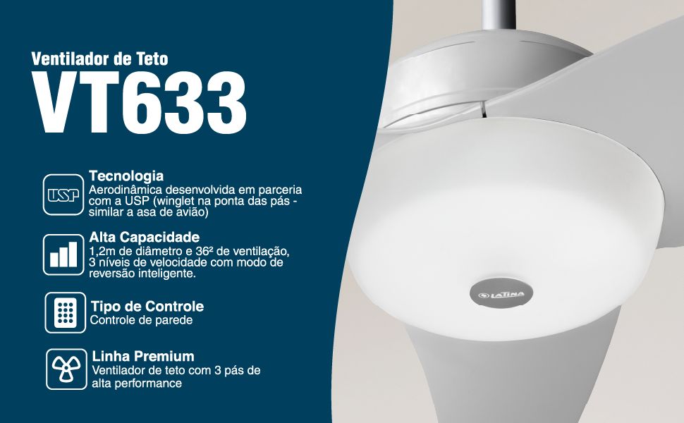 Ventilador de Teto Latina VT633 Com Controle de Parede – Cristal